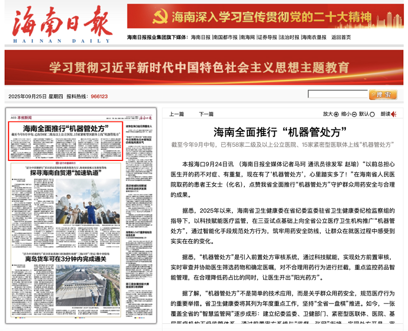 据悉,2025年以来,海南省卫生健康委在省纪委监委驻省卫生健康委纪检监察组的指导下,以科技赋能医疗监管,在三亚试点基础上向全省公立医疗卫生机构推广“机器管处方”,通过智能化手段规范处方行为,筑牢用药安全防线,让群众在就医过程中感受到实实在在的变化。