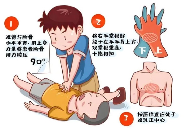 手法:双手交叠,掌根紧贴按压点,双臂伸直垂直下压。