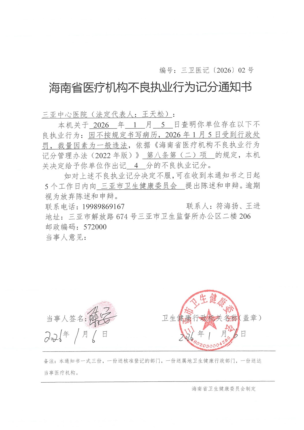 三亚中心医院不良执业行为记分通知书