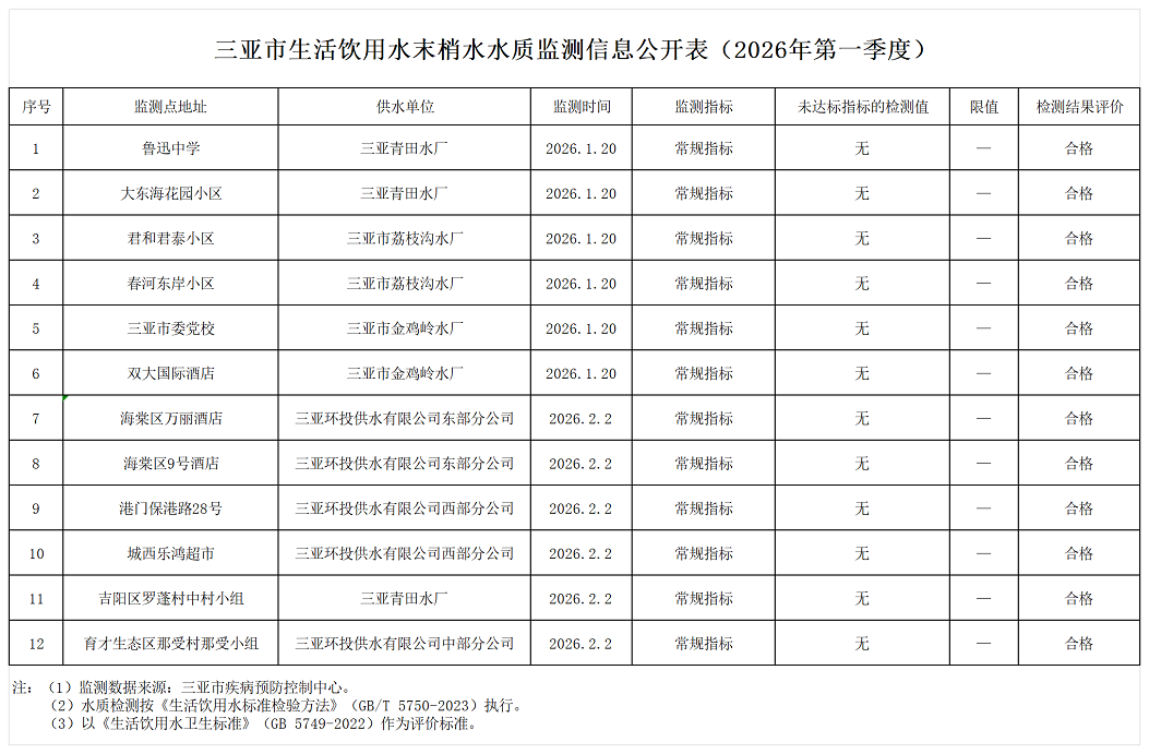 三亚市生活饮用水末梢水水质监测信息公开表(2026年第一季度)